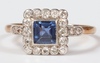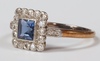 • An Edwardian 18ct yellow gold square cut sapphire and diamond cluster ring, the centre stone 0.5ct, the 16 brilliant cut diamonds each approx. 0.01ct, size Q, 3 grams