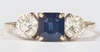 • An 18ct yellow gold sapphire and diamond 3 stone ring, the centre princess cut sapphire approx. 1ct, the 2 brilliant cut diamonds each approx. 0.5ct, size T, 3 grams