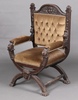 1235 A Victorian carved oak Italian style open arm chair, the crest carved a portrait mask, upholstered in brown buttoned material, raised on an X framed stretcher 80-100