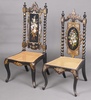 1237 A Victorian lacquered and inlaid mother of pearl high back chair, the slat back inlaid a floral panel, the seat of serpentine outline and 1 other (the back with iron repair) 80-120