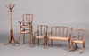 1242 A child's 1920's Thonet style bentwood and woven cane high chair 62cm h x 23cm w x 27cm d (repair to stretcher) together with a child's bentwood 2 seat sofa with oven cane seat 40cm x 42cm w x 20cm (old repair to back),ditto open arm chair 40cm h x 24cm w x 19cm (old repair to casting rail), a rocking chair 37cm h x 42cm w x 23cm d and a hat and coat stand 85cm x 27cm (1 arm missing) 50-75