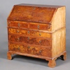 | 1168 | A Queen Anne quarter veneered walnut bureau with feather banding, the upper section fitted 2 short drawers, the fall front with book rest and revealing a well fitted interior with pigeon holes and drawers above 3 long drawers with ring drop handles, raised on bracket feet 104cm h x 101cm w x 55cm d | 100-150 |