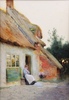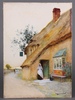 • Claude Strachan (British, 1865-1938), Lady outside a Thatched Public House, and a Lady outside a Thatched Cottage, a pair of late 19th/early 20th century watercolours, one signed, each 26cm x 19cm, unframed within gilt mounts.