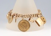 • A 9ct gold charm bracelet with padlock clasp, hung 12 numerous charms including a 1918 full sovereign and a 1911 half sovereign, gross weight 46.3 grams