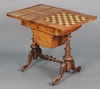A Victorian rectangular inlaid figured walnut games/work table, the flip top inlaid a chess board, cribbage board and backgammon board, the base fitted a drawer above basket, raised on turned bulbous supports with H framed stretcher 74cm h x 58cm w x 43cm d