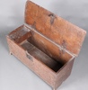 An early 17th Century elm boarded, slab-ended coffer, the front board decorated low relief foliate strapwork and fitted a square lock plate, the interior fitted a candle box with nail hinge 40cm h x 93cm w x 36cm d. Similar strapwork Cesinsk