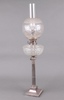 | 1090 | A cut glass oil lamp reservoir raised on a silver plated Corinthian column capital candlestick, converted to a table lamp, complete with opaque glass shade 42cm | 40-60 |