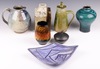 | 737 | A cylindrical black Art Pottery jar and cover incised TA 7cm, a brown glazed Art Pottery vase, do. dish, do. blue glazed vase, coffee pot and jug | 30-50 |