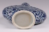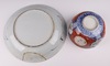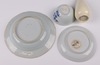 A Nankin Cargo blue and white tea bowl and saucer, the base with Christie's labels, a shaped blanc de chine porcelain vase 12cm and a Japanese blue and white bowl decorated a standing figure 16cm (crack and chipped)