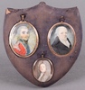 | 856 | Circle of Richard Cosway, Oval Miniature Portrait of a Gentleman wearing Army Uniform, early 19th century watercolour on ivory, within a metal frame, the reverse inset with a glass panel of woven hair 7.5cm x 5cm, together with an 18th century portrait miniature of a gentleman and a 19th century portrait miniature of a gentleman, all mounted on a shield form display stand. | 150-250 |