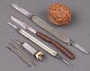 | 514 | Butler of Sheffield, a folding scalpel marked Butler Sheffield England with plastic grip 9cm, a folding pocket knife the steel blade marked JoWlke Republic of Ireland, the grip decorated the dates of the Monarchs of England, a gilt cased cigar cutter with folding knife and mother of pearl grip, folding twin bladed knife, a carved walnut and 2 bodkins | 50-75 |