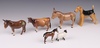 | 709 | Six Beswick figures - Jersey cow no.1345 11cm, Airedale Terrier no.962 13cm, 2 donkeys 14cm and 12cm, a shire foal 8cm and a sheep 5cm | 40-60 |