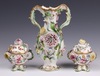 | 605 | A 19th Century Coalbrookdale style twin handled vase with floral encrusted decoration 23cm h, together with a pair of Spode style floral encrusted twin handled urns with floral decoration 11cm | 80-120 |