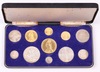A Queen Victoria Golden Jubilee specimen set 1887 comprising 5 pound, double sovereign, sovereign, half sovereign, crown, double florin, half crown, florin, shilling, sixpence and threepence, complete in fitted black leatherette case with gilt VR monogram