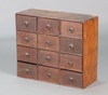 | 1008 | An 18th Century oak range of 12 shallow drawers with ring drop handles, 42cm h x 49cm w x 20cm d | 100-200 |