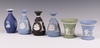 | 640 | A pair of Wedgwood blue Jasper ware club shaped vases 12cm, impressed 64 and 76, a black Jasper ware club shaped vase RF 12cm, a green Jasper ware trumpet shaped vase 64 8cm and a blue ditto | 30-50 |