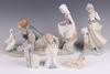 | 649 | A Lladro figure of a seated girl feeding geese 16cm, ditto standing girl with rabbit impressed 5, 23cm, ditto girl with doves (chip 1 wing) 22cm, ditto seated shepherd 15cm, girl (a/f) 15cm and 1 other of a baby B2291 9cm | 40-60 |