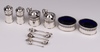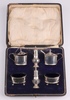 | 136 | A 6 piece Georgian style cased oval silver condiment set with pair of salts, pair of mustard pots (1 with spoon) and a pair of peppers, complete with blue glass liners (1 cracked), Birmingham 1922 by Adie Brothers Ltd., 150 grams | 120-160 |