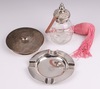 | 168 | A circular silver ashtray with engine turned decoration and monogrammed, Chester 1921, 11cm, 60 grams together with a cut glass perfume atomiser with silver collar, a circular silver powder puff lid the interior set a mirror (a/f) | 40-60 |