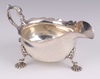 | 185 | A Georgian style silver sauce boat with wavy border, C scroll handle and hoof supports, Birmingham 1929 by Adie Brothers Ltd., 304 grams | 260-320 |