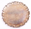 | 189 | An Indian silver salver with bracketed border, engraved inscription "Presented to Brigadier H M Cox CIE OBE MC and Mrs Cox by The Senior Staff of Iscon Consortium at Durgapur July 1959", 30cm, 935 grams | 800-1200 |