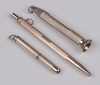 | 216 | A silver toothpick with engine turned decoration 1996 by William Manton, an engine turned silver cigar drill Birmingham 1994 by S J Rose & Son (dented), silver propelling pen with engine turned decoration Birmingham 1997 by William Manton, 26 grams | 50-75 |