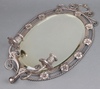 | 217 | An oval bevelled plate wall mirror contained in a pierced and engraved silver plated frame, the base with 2 sconces 48cm h x 30cm w | 60-80 |