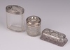 | 138 | A cut glass faceted pin jar with embossed silver lid Birmingham 1907 10cm, a rectangular ditto Birmingham 1906 9cm, a glass hair tidy with silver collar Chester 1923 6cm, weighable silver 37 grams | 40-60 |