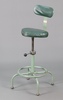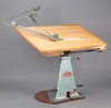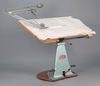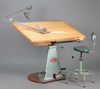 A grey Simplon draughting table/desk, c.1960s, fitted with a Mavitta Master 360 draughting machine with Admell Fingalite adjustable lamp. The tapered triangular cast-iron base was manufactured by Dargue Brothers at Simplon Works, Halifax, and features a central red Simplon logo, pedals, and rubber footrests. The base supporting a pine table top with attached draughting machine. Together with a revolving steel high chair by ROC Birmingham