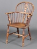 1003 A 19th Century beech stick and rail back kitchen carver chair on turned supports with H framed stretcher 92cm h x 61cm w x 52cm d 50-75