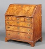 | 926 | A Queen Anne walnut and crossbanded bureau, the fall front revealing a well fitted stepped interior with cupboard, pigeon holes, secret drawer and drawers above 3 short and 3 long drawers, raised on bracket feet 104cm h x 88cm w x 50cm d | 400-600 |