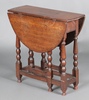 | 934 | A 19th Century, 17th Century style, oak oval drop flap gateleg tea table, raised on turned supports 67cm h x 67cm w x 24cm | 50-75 |