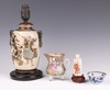 | 705 | A Japanese Satsuma pottery vase decorated warriors converted to a table lamp 23cm, a Canton famille rose jug of waisted form raised on 3 feet 9cm (cracked), a Chinese blue and white octagonal tea bowl with panel decoration of figures 4cm (some chips to the rim), a miniature Rollo vase decorated courtly figures 8cm | 60-80 |