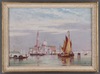 Henry Pilleau ( British, 1815-1899), Barges and Gondolas on the Lagoon, Venice, oil on card, signed with monogram, 17cm x 24cm, within a painted wood and gilt frame.