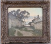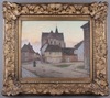 Louis Braquaval (French, 1854-1919), Village Scene with Church, Houses and a Figure on a Road, late 19th/early 20th century oil on panel, signed, 36cm x 44cm, within a gilt composition frame with foliate strapwork and corner crestings.