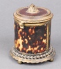 | 468 | A 19th Century square cut glass bottle with gilt decoration (chip to lid) contained in a cylindrical gilt metal and tortoiseshell case 10cm x 9cm | 40-60 |