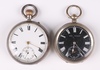 | 432 | Burnsdean 609 Commercial Road London, a silver cased open faced key wind pocket watch with enamelled dial, Roman numerals, subsidiary second hand, the movement numbered 87067, London 1901 (currently running), together with a John Walker 76 The Strand, a Continental silver cased open face key wind pocket watch with black dial, Roman numerals, subsidiary second hand (currently running, no key) | 50-75 |