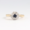 | 32 | A gold and platinum ring marked 18ct PLAT sapphire and diamond cluster ring, size F 1/2, 3.4g | 100-150 |