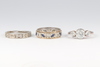 | 40 | A white and yellow gold marked 9ct eternity ring, set blue and white stones, size K, 3.3g, a white metal and illusion diamond set ring (a/f) 1.9g gross, together with a paste set ring | 80-100 |