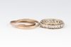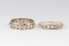 | 47 | A 9ct 2 colour gold entwined wedding band (hallmarks rubbed) size P, 1.7g, together with a yellow metal and paste set eternity ring size K 1/2 | 70-90 |