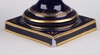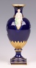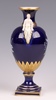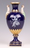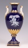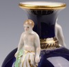 • A Meissen blue glazed porcelain twin handled vase decorated a seated cherub, the base with crossed sword and marked 30R47, 15cm