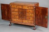 A Queen Anne walnut cabinet with moulded cornice, the interior fitted 2 drawers above cupboard fitted and 2 drawers flanked by 6 drawers, above 3 short drawers, enclosed by panelled doors, formerly the top of a chest on stand, raised on later cabriole ball and claw supports 90cm h x 100cm w x 45cm d