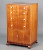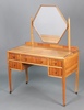Gaylayde, a 1930's Art Deco inlaid figured walnut 5 piece bedroom suite comprising triple wardrobe, 1 section fitted 2 recesses and 2 trays, raised on bracket feet 189cm h x 146cm w x 50cm d, dressing table with hexagonal bevelled plate mirror above 1 long and 2 short drawers raised on square tapered supports 145cm h x 106cm w x 55cm d, rectangular dressing table stool with upholstered seat on square supports with H framed stretcher 44cm h x 75cm w x 41cm d, a tallboy fitted 4 drawers above cupboard enclosed by panelled doors with ivory handles raised on bracket feet 113cm h x 68cm w x 52cm d and a panel end bedstead 119cm h x 152cm w Ivory Exemption Certificate 2LNC4TWT