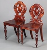 | 960 | A pair of Victorian mahogany hall chairs with pierced shield shaped backs and solid seats of serpentine outline, raised on turned supports 84cm h x 43cm w x 34cm d | 80-120 |