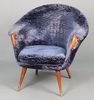 | 966 | A 1950's tub back armchair upholstered in blue material, raised on turned beech supports with metal caps 77cm h x 83cm w | 40-60 |