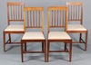 | 967 | A set of 4 Edwardian inlaid mahogany stick and rail back dining chairs with upholstered drop in seats, raised on square tapered supports with H framed stretcher 94cm h x 45cm w x 43cm d | 50-75 |