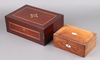 | 991 | A 19th Century rectangular inlaid mahogany trinket box with hinged lid, the interior with divided tray 12cm h x 33cm w x 23cm d (missing lock, veneer lifting to side) together with a Victorian rectangular inlaid rosewood and mother of pearl trinket box with hinged lid fitted a tray 9cm h x 22cm w x 15cm d (missing small sections of veneer in places) | 40-50 |