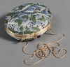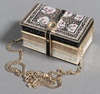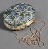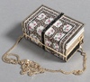 • Judith Leiber, a lady's clutch bag in the form of 3 books 13cm x 8cm x 6cm with purse and a Judith Lieber oval clutch bag 10cm x 4cm x 6cm containing a gilt metal hand mirror, both with outer cloth bags, together with a Glomesh silver coloured evening bag