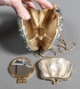 • Judith Lieber, a rectangular black and gilt sequinned clutch bag 18cm x 8cm x 3cm containing 2 gilt combs and a hand mirror, together with a Judith Lieber arch shaped clutch bag containing a hand mirror, purse and comb, both with cloth outer bags