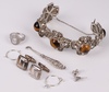 | 76 | A white metal filigree bracelet set cabochon cut tigers eye, a pair of silver T bar cufflinks, pair of silver earrings, a silver and paste set dress ring, a pair of silver heart shaped paste set earrings and a silver handled button hook | 40-60 |